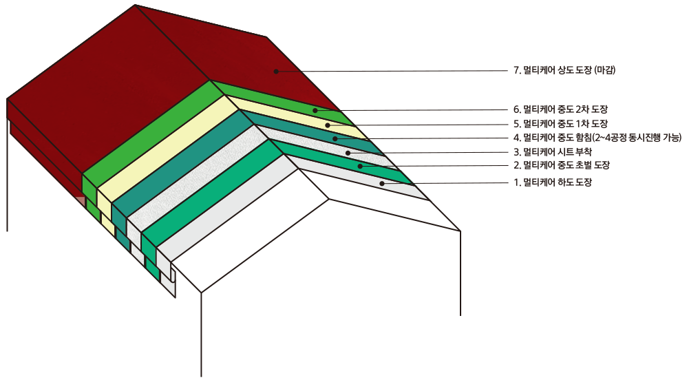 차열도료(상도)로 마감하여 자외선을 차단하며, 표면의 온도 상승억제 및 에너지 절감, 방수층 보호로 내후성이 증가됩니다.